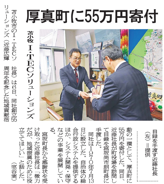 当社はこの7月で創立55周年を記念し、地域貢献活動の一環として厚真町に